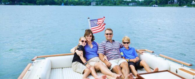 • Family enjoying a boat ride on a lake, symbolizing financial freedom after Chapter 13 bankruptcy with Brock Legal.